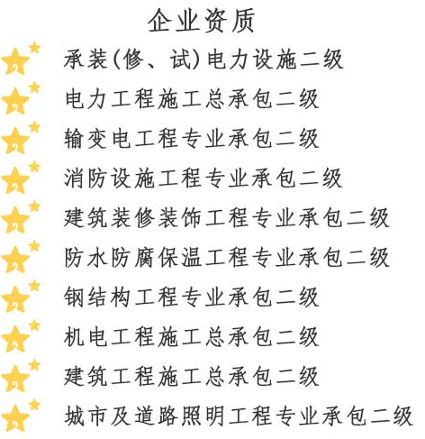 金楓電力集團(tuán)有限公司,成立于2015年5月28日,注冊(cè)資金6060萬元,是一家專業(yè)從事電力工程施工的集團(tuán)化公司。公司經(jīng)營(yíng)范圍包括:電氣安裝服務(wù);建設(shè)工程施工;輸電、供電、受電電力設(shè)施的安裝、維修和試驗(yàn);測(cè)繪服務(wù);建筑勞務(wù)分包;建筑工程設(shè)計(jì);發(fā)電機(jī)及發(fā)電機(jī)組制造;建筑工程機(jī)械與設(shè)備租賃;工業(yè)工程設(shè)計(jì)服務(wù);技術(shù)服務(wù)、技術(shù)開發(fā)、技術(shù)咨詢、技術(shù)交流、技術(shù)轉(zhuǎn)讓、技術(shù)推廣等。公司持有國(guó)家能源局頒發(fā)的承裝(修、試)電力設(shè)施許可證,承裝類二級(jí)、承修類二級(jí)、承試類二級(jí)資質(zhì);電力工程施工總承包二級(jí)資質(zhì);輸變電工程專業(yè)承包二級(jí)資質(zhì);建筑裝修裝飾工程專業(yè)承包二級(jí)資質(zhì);消防設(shè)施工程專業(yè)承包二級(jí)資質(zhì);防水防腐保溫工程專業(yè)承包二級(jí)資質(zhì);施工勞務(wù)資質(zhì);機(jī)電工程施工總承包二級(jí);建筑工程施工總承包二級(jí);城市及道路照明工程專業(yè)承包二級(jí);鋼結(jié)構(gòu)工程專業(yè)承包二級(jí)資質(zhì);公司已通過質(zhì)量管理體系認(rèn)證、環(huán)境管理體系認(rèn)證及職業(yè)健康安全管理體系認(rèn)證。并獲得省級(jí)信用評(píng)價(jià)AAA證書;連續(xù)多年納稅信用評(píng)價(jià)A級(jí)。